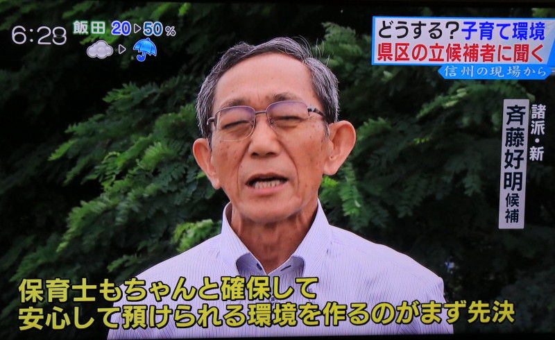 SBC(信越放送)の夕方のニュースで、保育所・待機児童問題で候補者の意見を聞く企画があり、斉藤候補もインタビューに答えて、保育所の増設や保育士の待遇改善により女性が働きやすい環境を作る重要性を訴えた(左写真)。