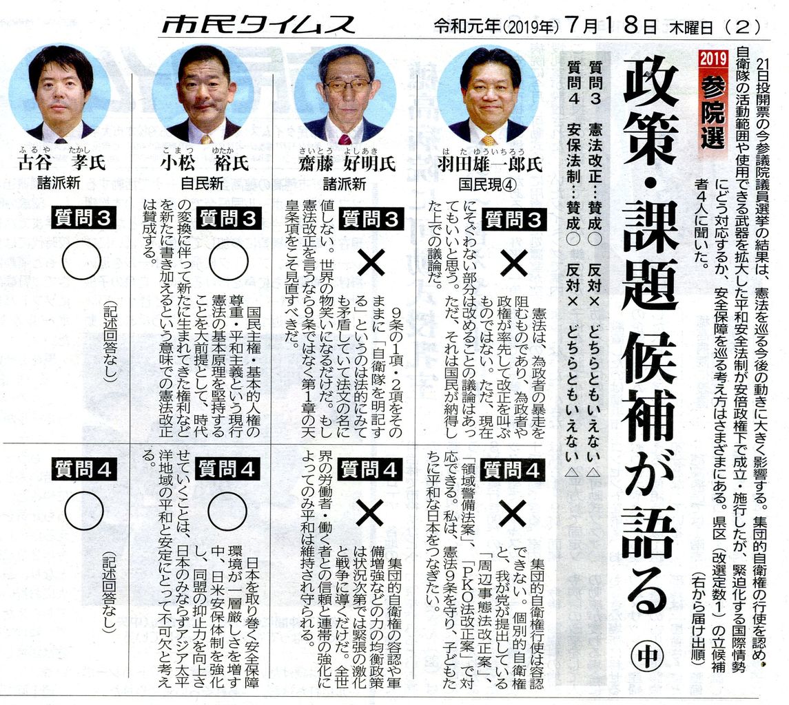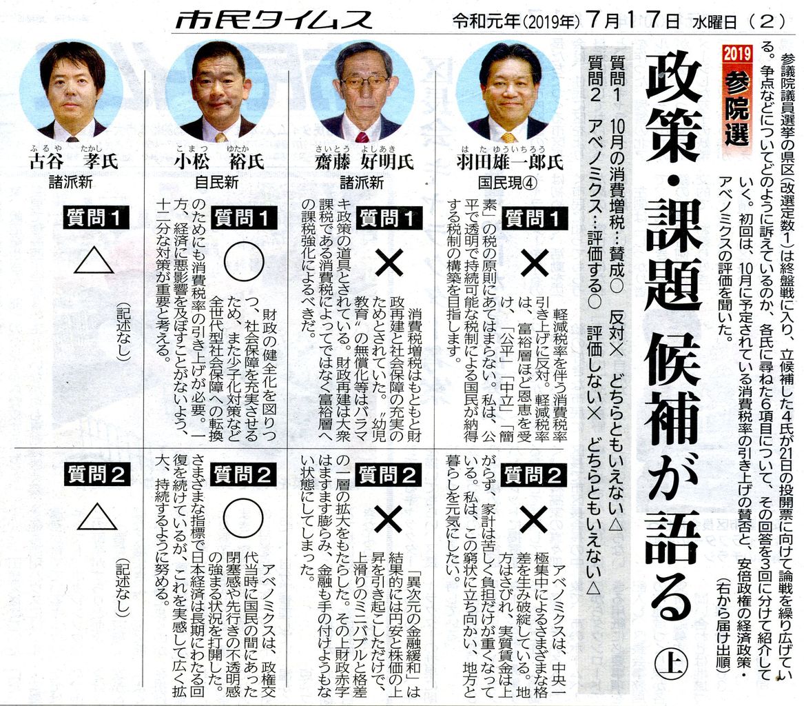 市民タイムス(中信地域版)が17日から3回にわたって6項目にわたる質問に対する候補者の意見を紹介していた(後掲)。
