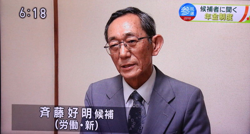 6:10pmからのNHKテレビ・イブニング信州が年金問題で候補者の意見を聞く企画を組み、2番目に斉藤候補が出演(右写真)、年金格差の是正を訴える。