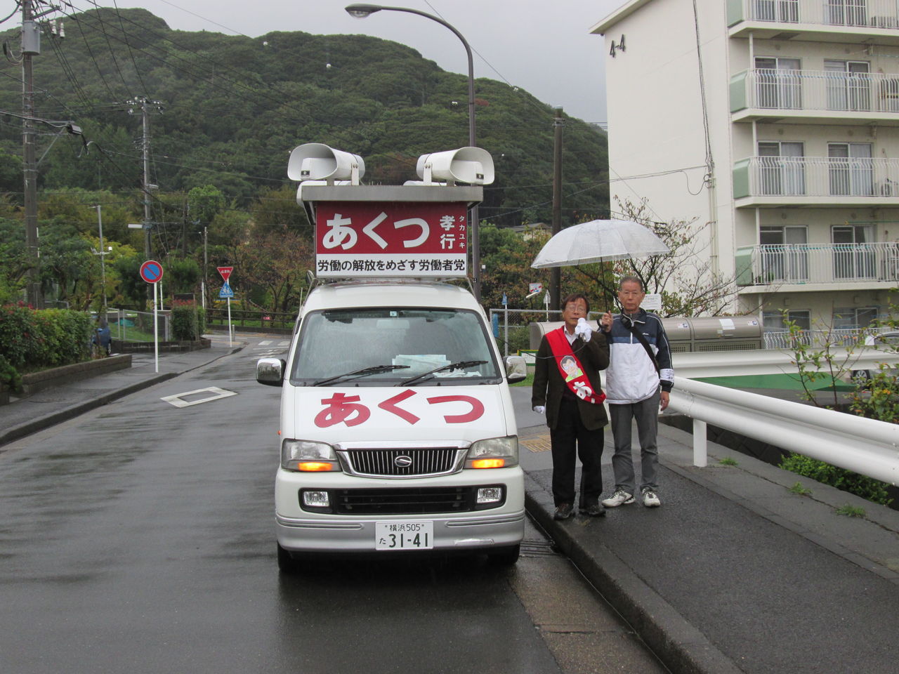 15日はJR衣笠駅での7時からの朝立ち、マイクは使用できませんがあくつが立候補しているというアピールにはなったと思います。8時からの街宣を出発に長坂市営団地で小演説、三崎港周辺で連呼、城ケ島、三浦海岸で流し、横須賀中央に帰る途中、団地で小演説をくりかえしました。長坂団地では団地の部屋から教え子が出てきてあくつさんと話す。夕方は“小泉タワー”の向側で演説会。雨、風の強い一日だったが、ひるまずに闘いぬきました。